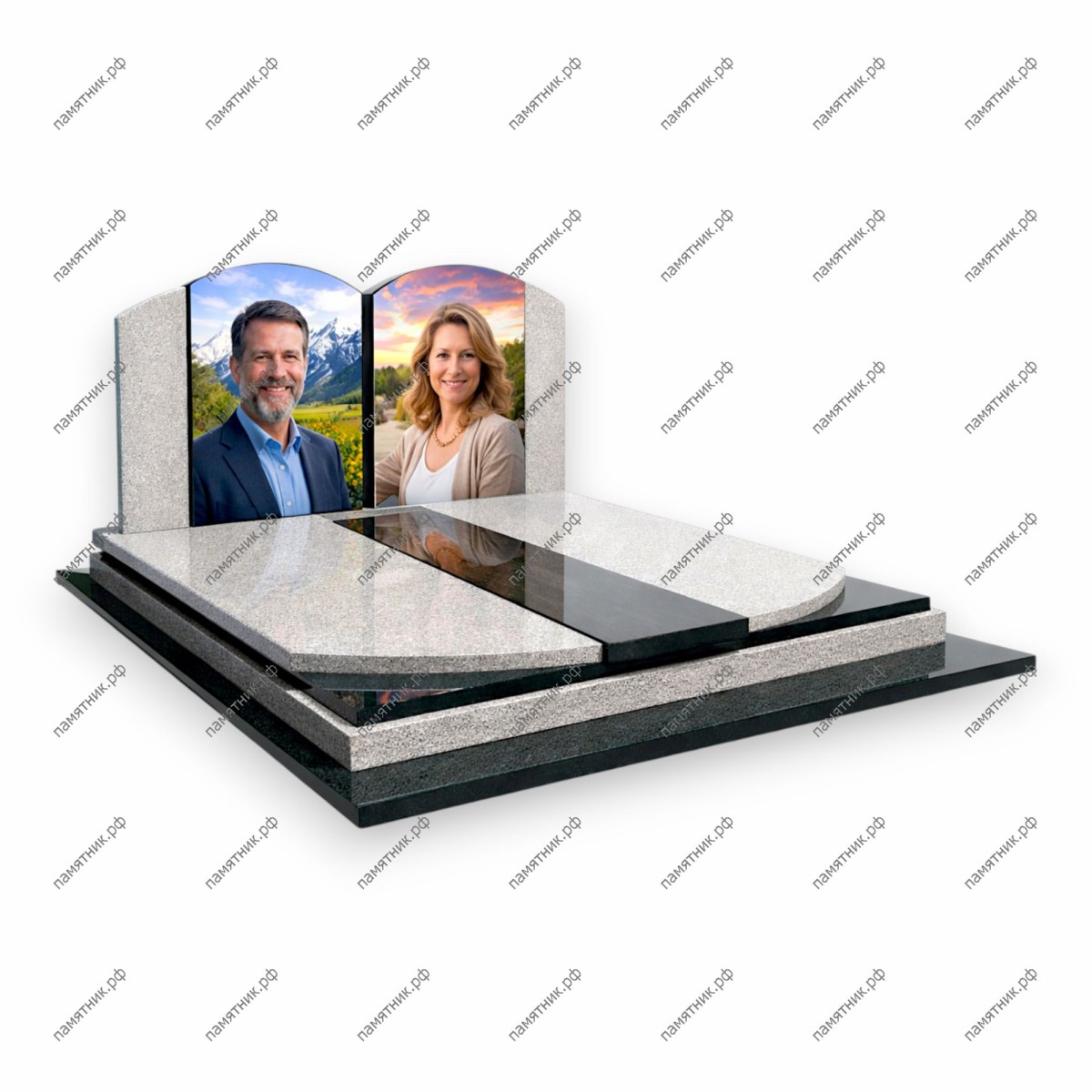 Классический семейный мемориал в светлых тонах с акцентом на зеркальную полировку. Две арочные стелы объединены общей платформой, а центральная вставка из черного гранита создает строгую вертикальную ось, подчеркивая торжественность композиции.
