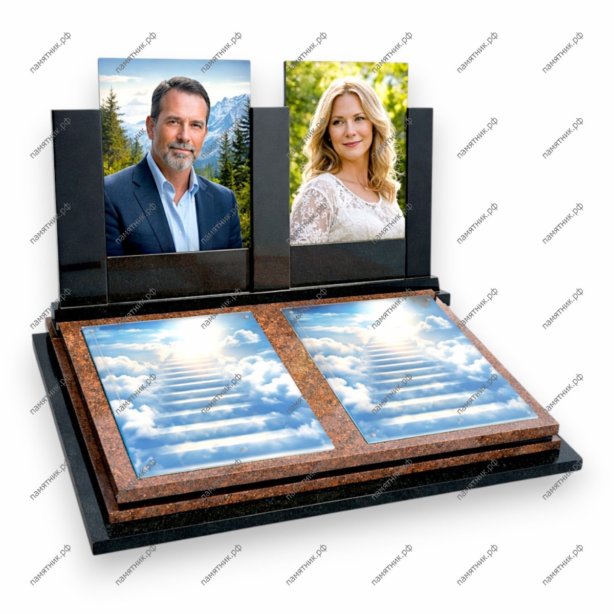 Яркая и современная модель на теплом красном основании. Два портретных блока из черного камня дополнены симметричными стеклянными вставками на подиуме, создающими эффект светящихся окон в облачное небо.