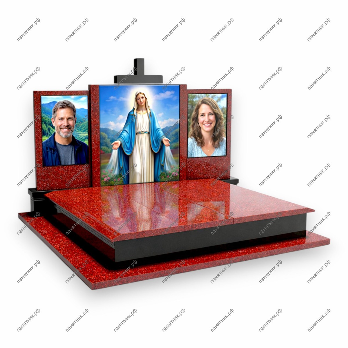 Величественный семейный триптих в насыщенном красном граните. В центре расположена икона Божией Матери, по бокам от которой размещены портреты усопших, что превращает памятник в настоящий мемориальный алтарь.