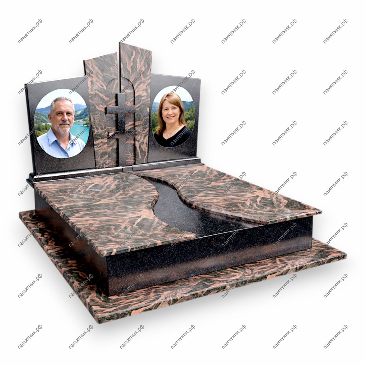 Динамичный комплекс из текстурного камня. Главной особенностью является декоративный вырез в виде «реки» на надгробной плите, символизирующий течение жизни. Сложная архитектура стелы с центральным крестом гармонично дополняет овальные портреты.