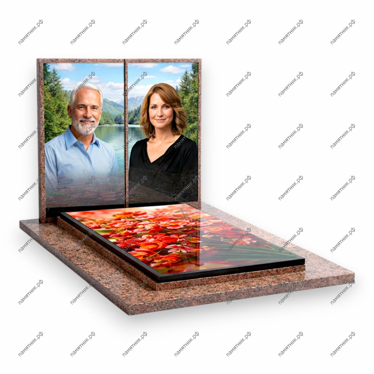 Теплый и живописный мемориал из красного камня. Доминантой выступает масштабное фотостекло на надгробной плите с яркими цветами, которое словно продолжает лесной пейзаж основной стелы.