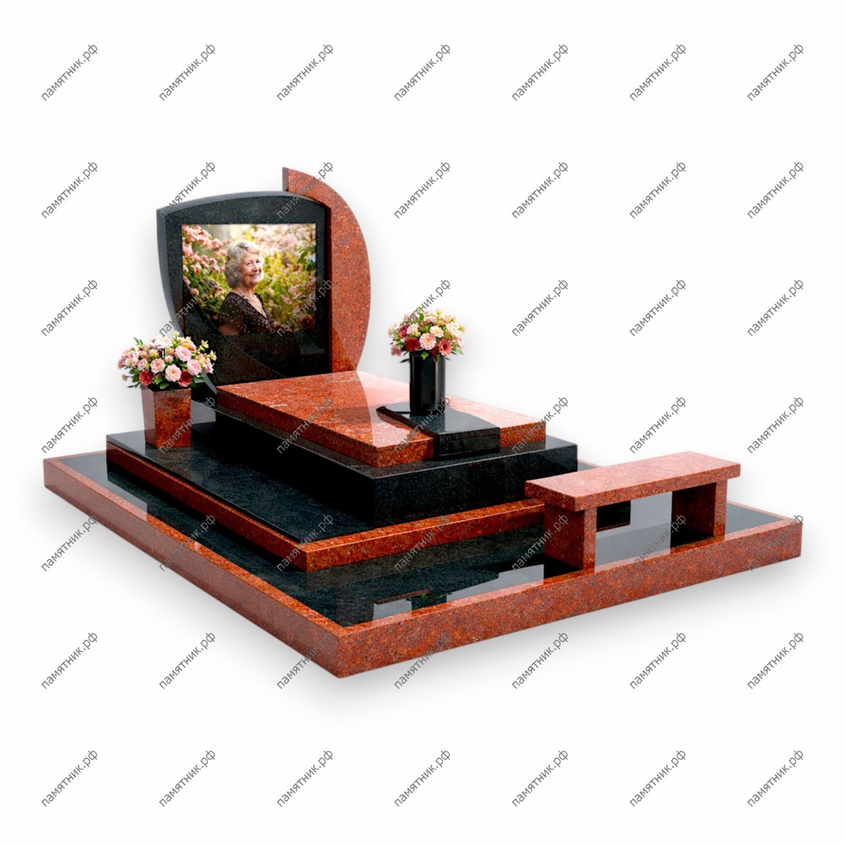 Монументальный ансамбль в красно-черном исполнении, создающий законченное место для поминовения. Композиция включает в себя фигурную стелу в форме щита с портретом, обрамленную изящной дугой из красного камня. Комплекс дополнен функциональными элементами: гранитной скамьей и вазонами для цветов.