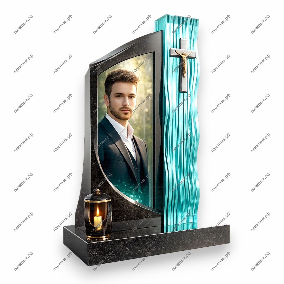 Памятник со стеклом ПС-29 — элегантное сочетание строгой геометрии камня и мягких волн стекла. Черная гранитная рама обрамляет портрет, а рядом установлена высокая стеклянная колонна бирюзового цвета с накладным золотым распятием. Лаконичная лампада на переднем плане завершает этот гармоничный образ.