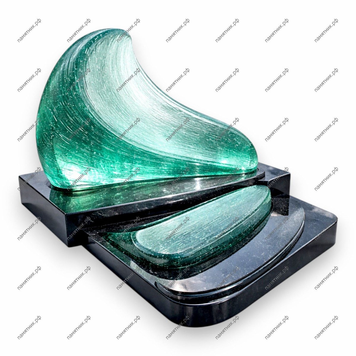 Памятник со стеклом ПС-30 — это современный низкопрофильный мемориал, выполненный в форме двух капель. Крупный стеклянный элемент из бирюзового стекла с пузырьковой текстурой плавно перетекает в меньшую «каплю» в основании. Модель отличается исключительной мягкостью линий и футуристичным дизайном.