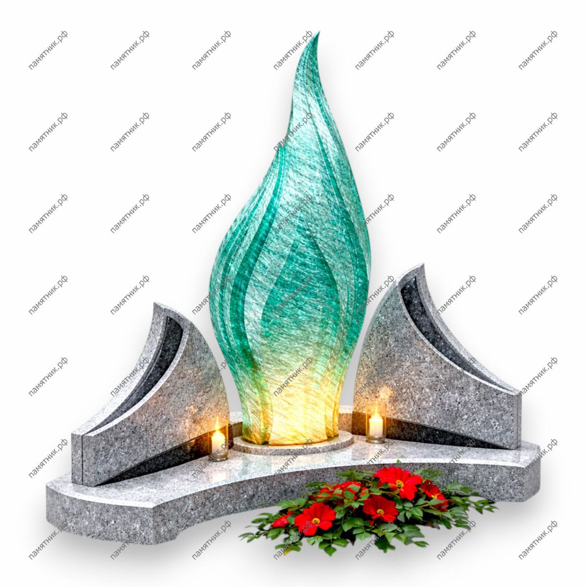 Памятник ПС-31 — это величественная композиция, центральным элементом которой является стела в форме высокого языка пламени. Бирюзовое художественное стекло с внутренней вертикальной текстурой создает эффект живого огня. Композиция дополнена симметричными гранитными элементами, напоминающими раскрытые крылья или волны.