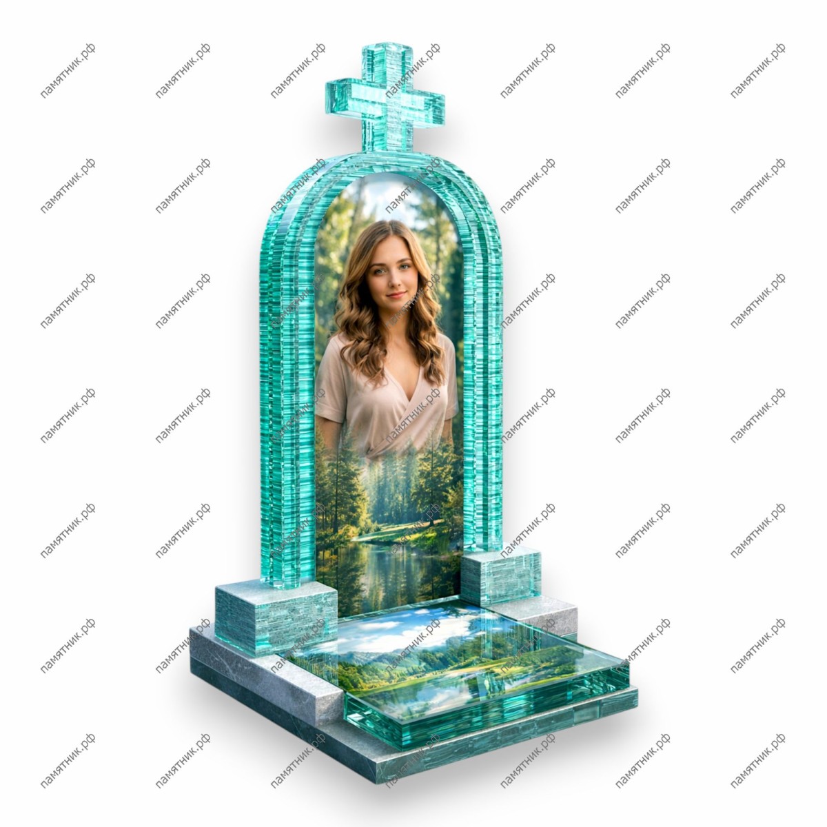 Модель ПС-38 представляет собой изящную арку из наборного стекла. Внутри арки расположено широкоформатное изображение на стекле, которое плавно переходит в горизонтальную надгробную плиту, создавая эффект непрерывного пейзажа.