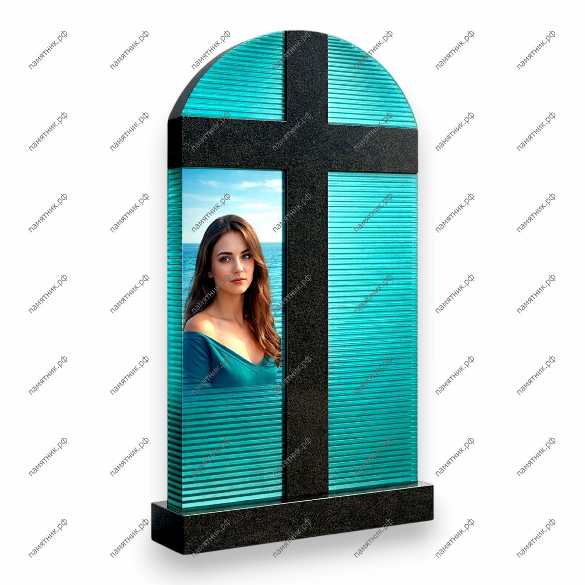 Модель ПС-41 — это строгое и архитектурное решение. Центральный гранитный крест служит каркасом для четырех стеклянных панелей с выраженной горизонтальной фактурой. Портрет интегрирован непосредственно в структуру стекла, что создает эффект «окна» в вечность.