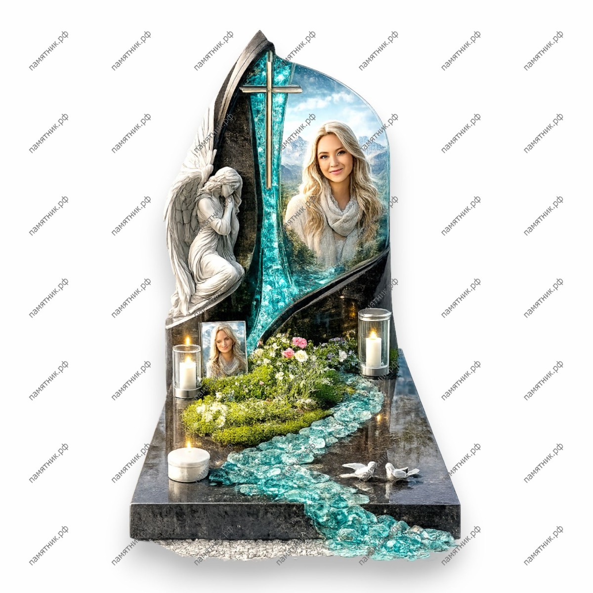 Самый сложный и детализированный мемориал в блоке. Включает в себя скульптуру плачущего ангела, стеклянный крест и «реку памяти» из стеклянной крошки, которая течет от подножия стелы через весь участок.