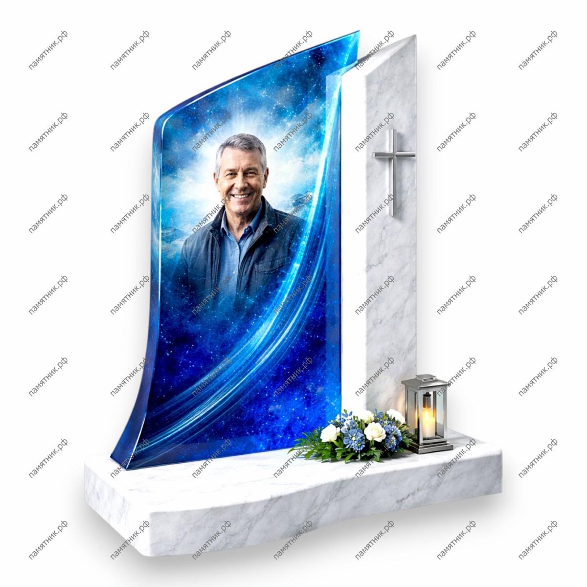 Модель ПС-51 — это высокохудожественная композиция в светлых тонах. Основная стела выполнена из закаленного стекла с полноцветной печатью космической тематики («Млечный путь»), что создает эффект бесконечной глубины. Белоснежный мраморный пилон с лаконичным крестом подчеркивает чистоту и торжественность мемориала.