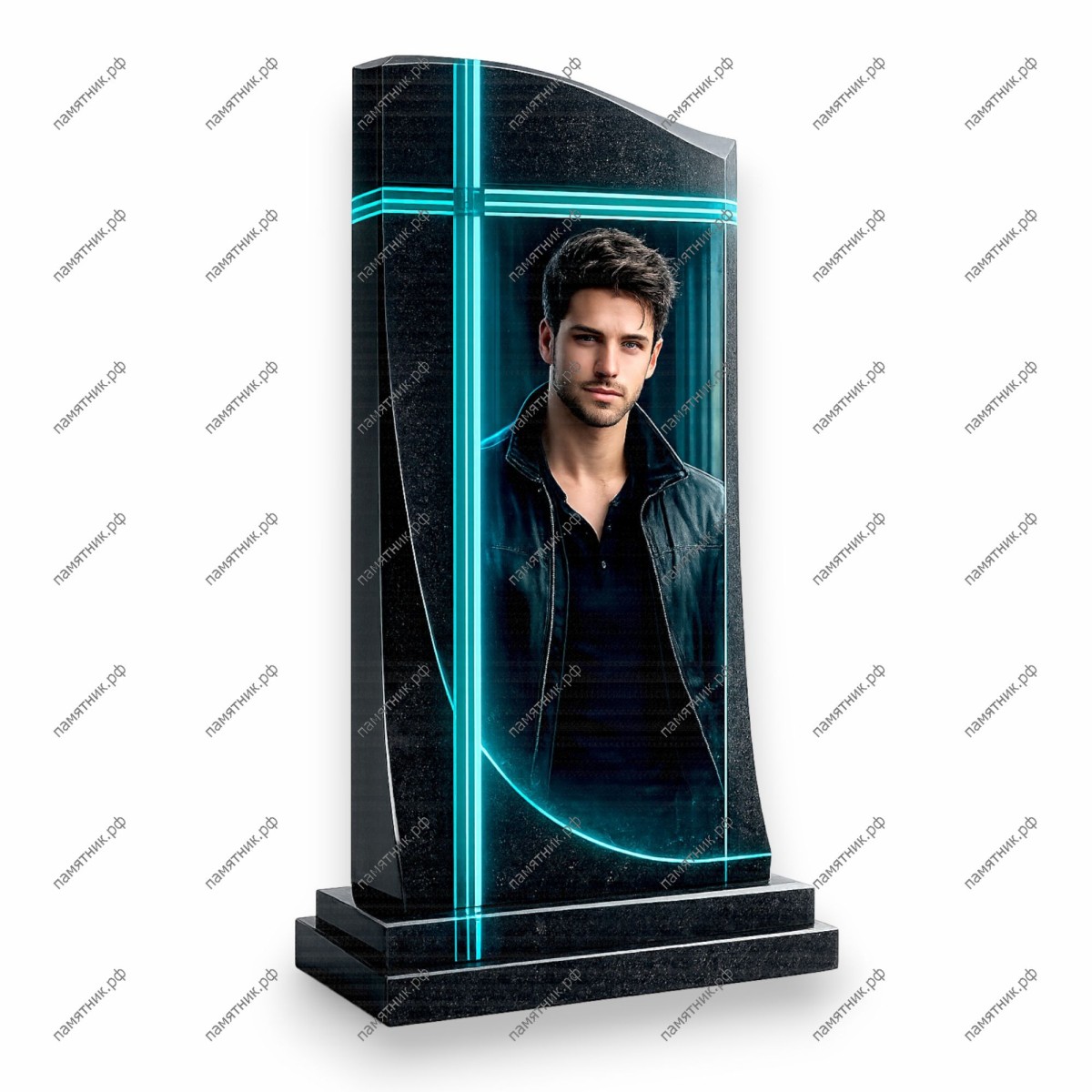 Самая технологичная модель в блоке. Дизайн выполнен в стиле «неон»: на черном граните выгравированы тонкие линии, заполненные светящимся бирюзовым составом или подсвеченным стеклом. Дугообразные элементы пересекаются, образуя современный символ креста.
