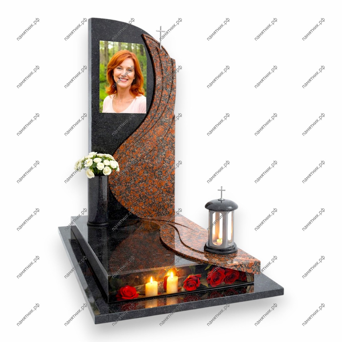 ПС-64 — это элегантная двухцветная композиция с плавными изгибами. Волнообразная вставка из красного гранита на черной стеле гармонирует с «рекой памяти» в основании, где под стеклом расположены алые розы и горящие свечи.