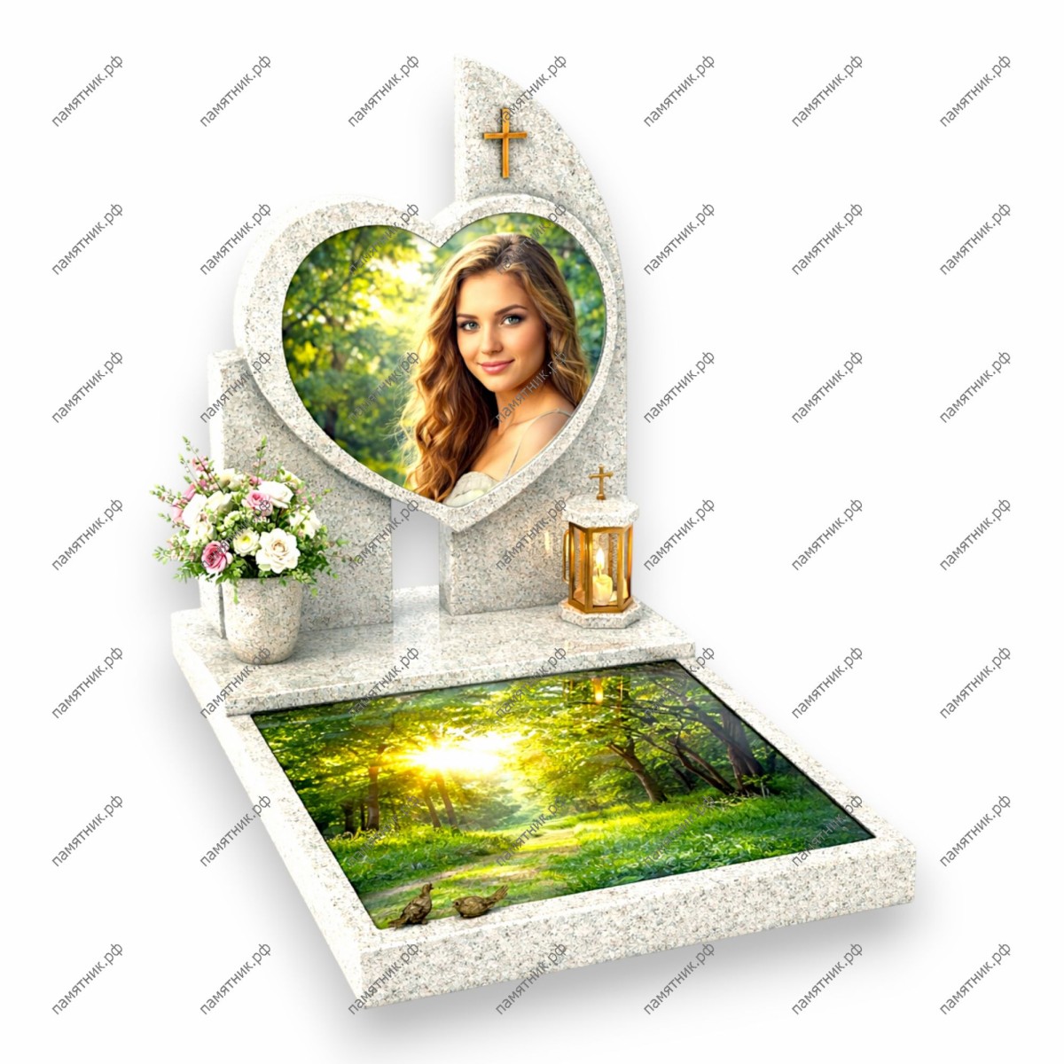Светлая и нежная модель ПС-65 выполнена в форме сердца из серого гранита. Основание украшено стеклянной панелью с изображением залитой солнцем лесной тропы, создающей ощущение умиротворения и надежды.