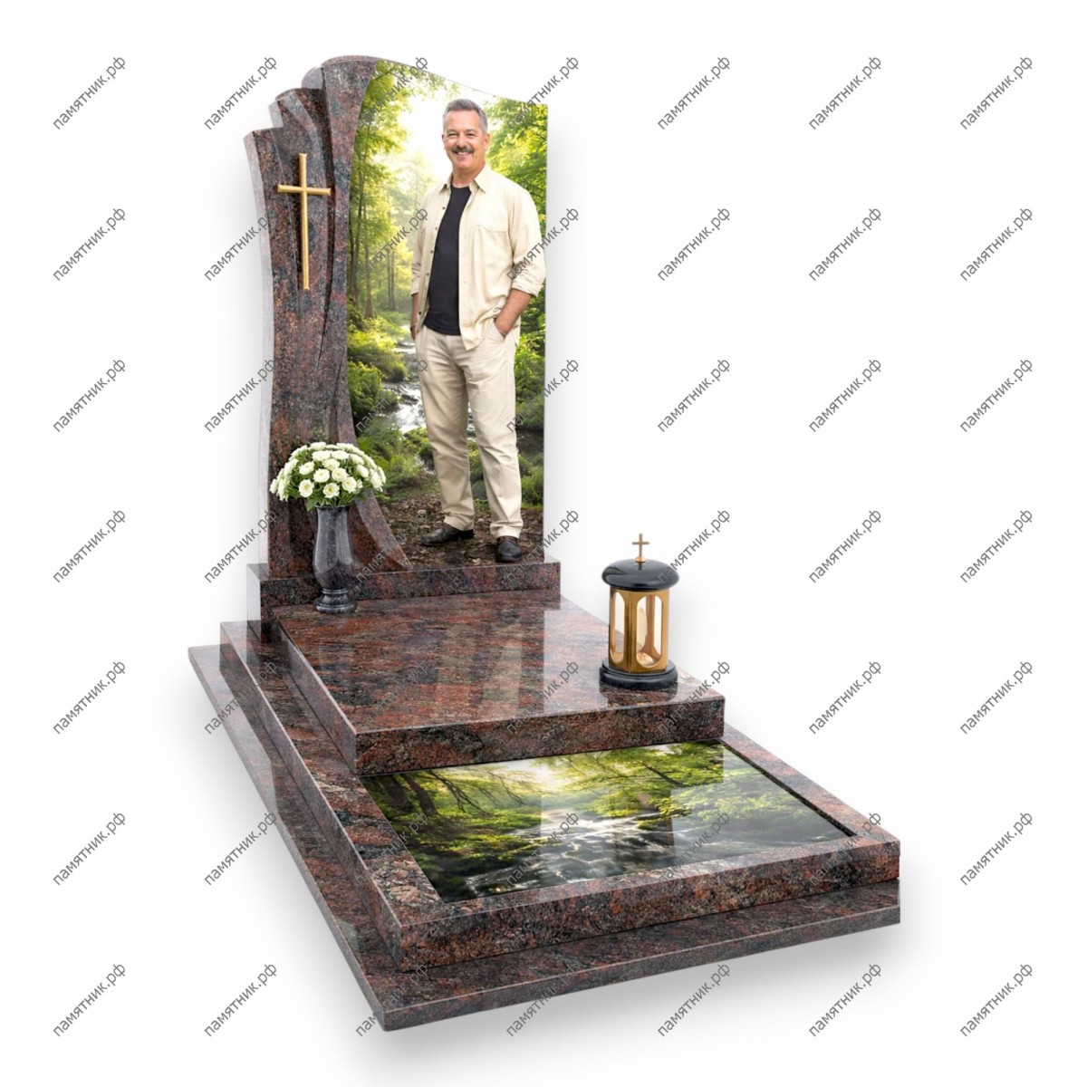 Монументальная модель, посвященная красоте первозданной природы. Центральная часть композиции — вертикальный пейзаж с водопадом, который находит свое продолжение в горизонтальной плоскости надгробия, создавая единый визуальный поток.