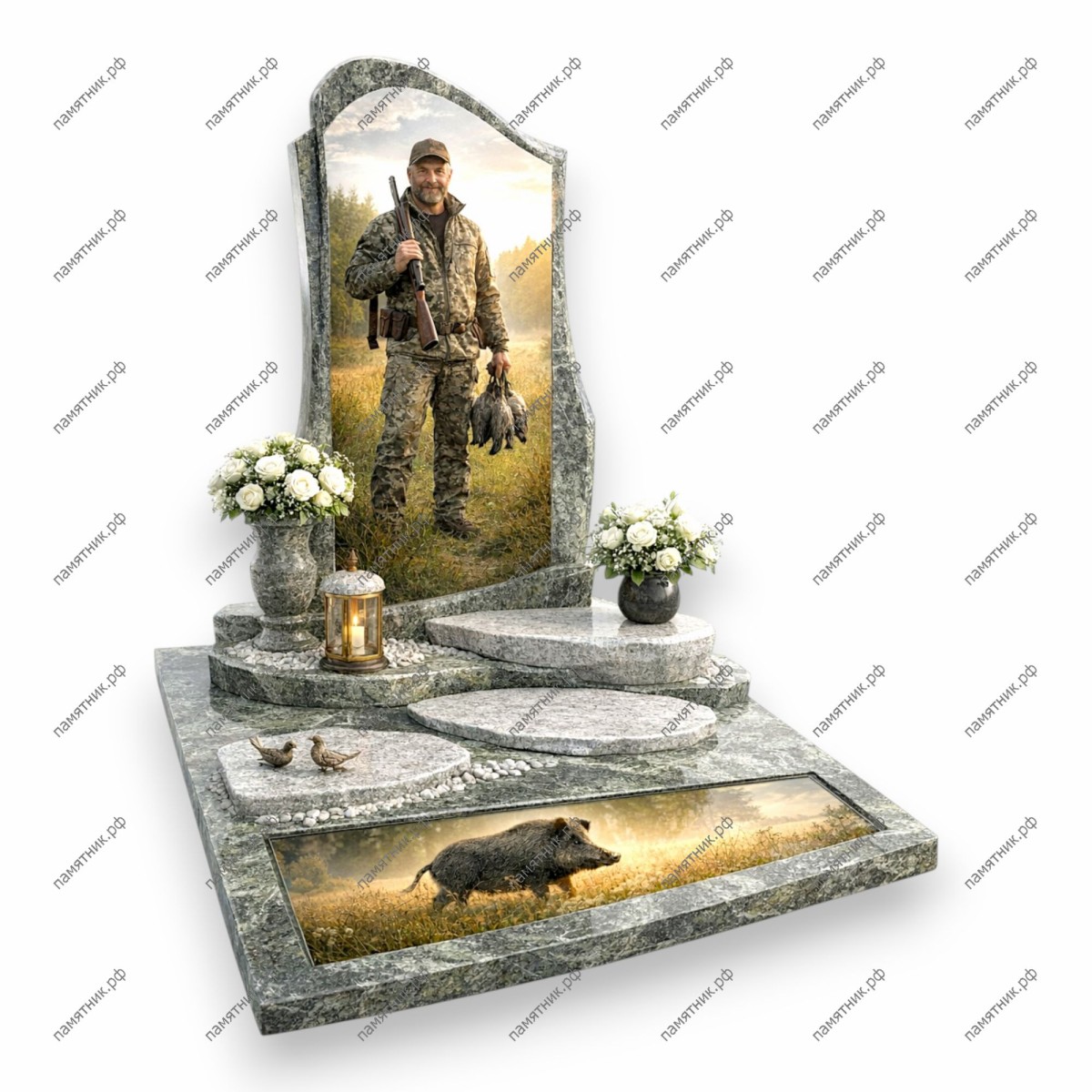 Тематический памятник для охотника или любителя леса. Сложная многоуровневая конструкция из серого камня включает стеклянную вставку с изображением бегущего кабана в естественной среде обитания.