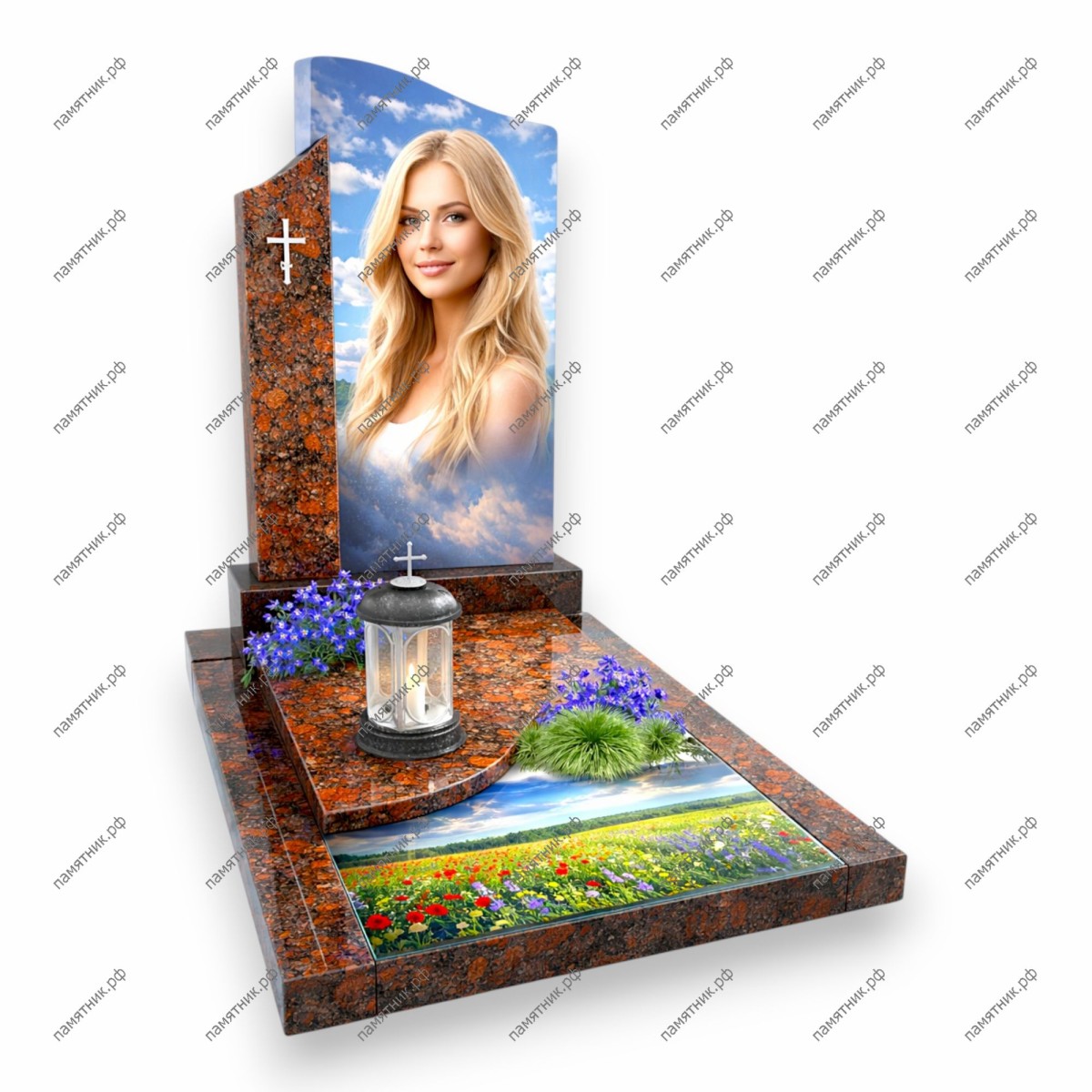 Нежный мемориал «Цветочное поле». Стела из теплого красного гранита дополнена яркой стеклянной вставкой с изображением макового поля под голубым небом.