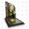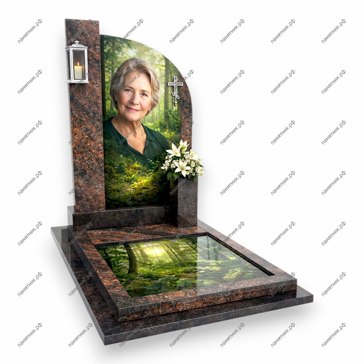Модель ПС-92 представляет собой архитектурную композицию из насыщенного коричневого гранита. Конструкция состоит из высокой колонны с фонарем и основной стелы с портретом на фоне солнечного леса. Изображение природы продолжается на надгробной плите, создавая эффект глубокой перспективы.
