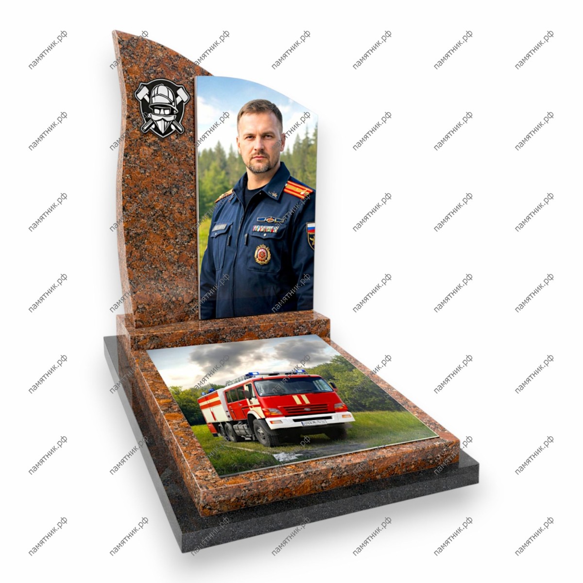 Тематическая модель ПС-94, посвященная профессиональному подвигу пожарного. Стела украшена гравировкой эмблемы службы, а в основание вмонтировано яркое стеклянное панно с изображением спецтехники, что подчеркивает прижизненное призвание человека.