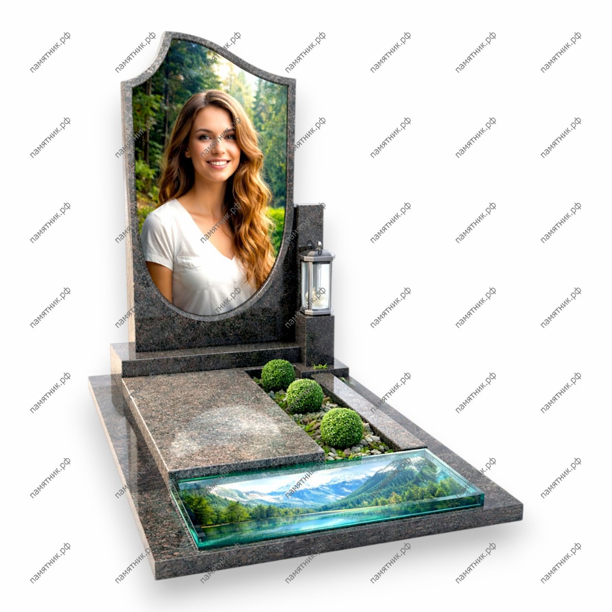 Памятник ПС-98 сочетает классическую форму щита и современный ландшафтный дизайн. Коричневый гранит с активным рисунком дополнен подиумом, где предусмотрены зоны для живых растений и панорамная вставка с горным озером.