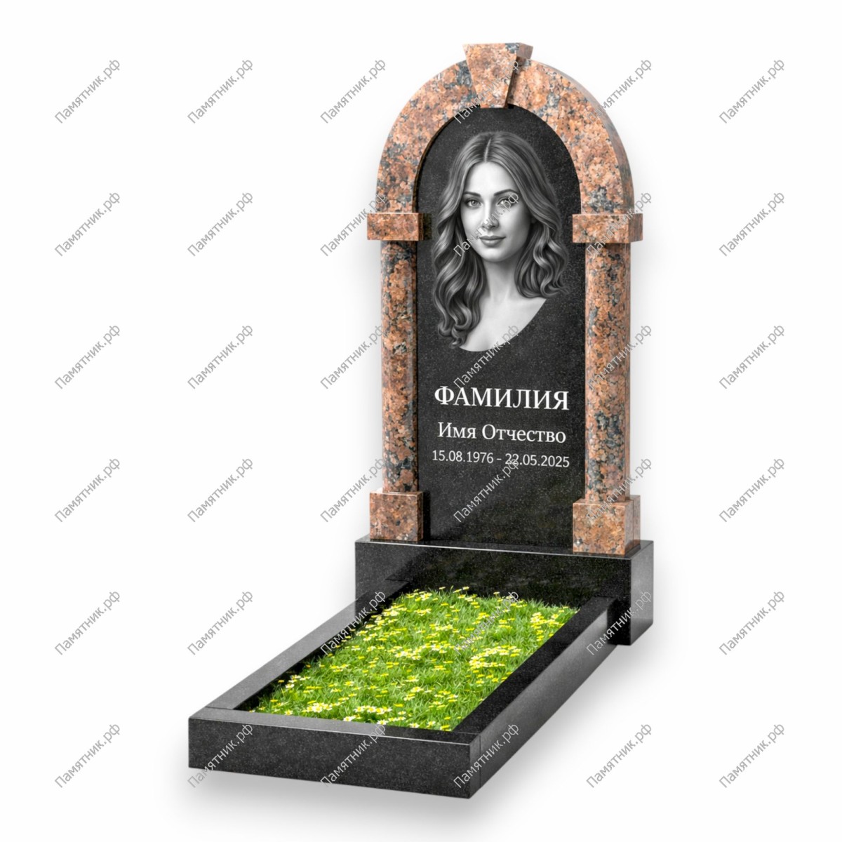 Памятник-арка А-12 — это высокая, устремленная вверх арка, символизирующая светлый путь души и вечный покой. Строгая симметрия стелы поддерживается надежной гранитной тумбой, которая служит прочным фундаментом всей конструкции. Цветник из полированных балок позволяет оформить место захоронения живыми цветами или декоративной отсыпкой, подчеркивая ухоженность мемориала.