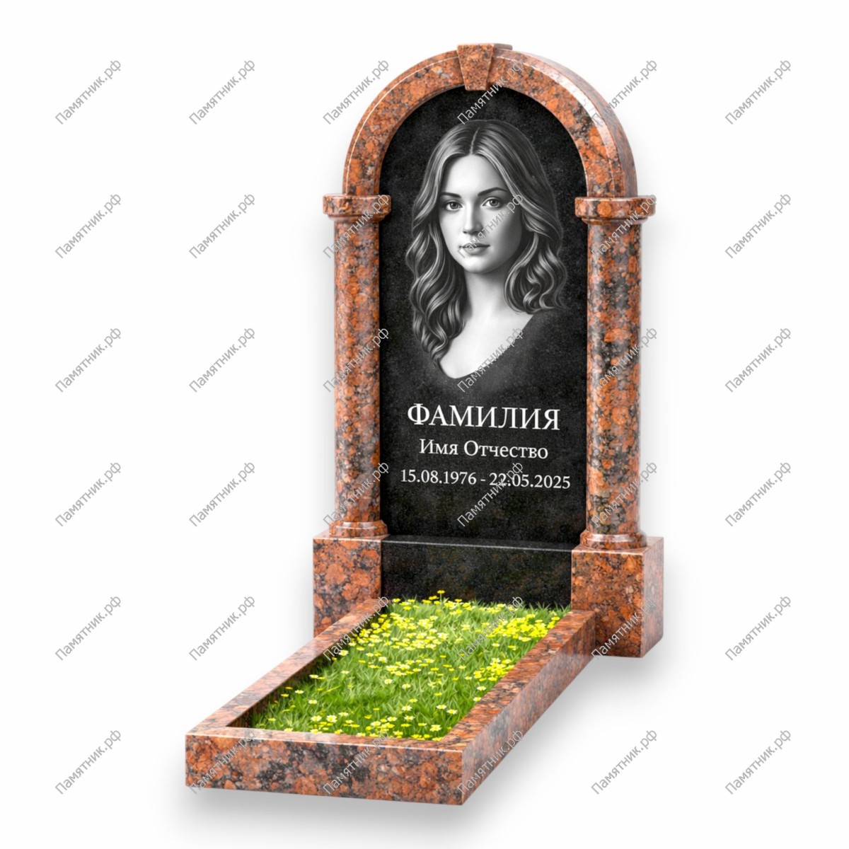 Памятник-арка А-23 — это торжественная арка с акцентом на объем. Особенностью памятника являются широкие декоративные фаски по всему контуру стелы, которые визуально делают камень более массивным и значительным. Плавный изгиб купола создает атмосферу умиротворения и покоя.