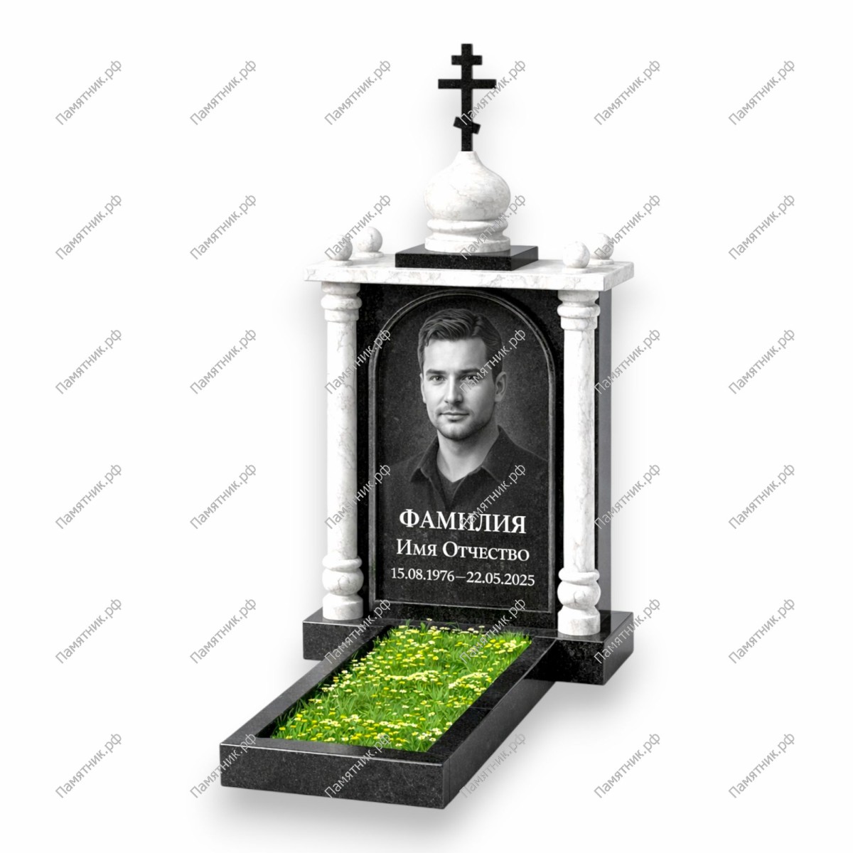 Материалом служит премиальный гранит. Камень не впитывает воду и устойчив к резким перепадам температур. Круговая полировка всех элементов комплекта подчеркивает статусность мемориала. Открытый цветник из гранитных брусьев позволяет эстетично оформить место памяти живыми цветами.