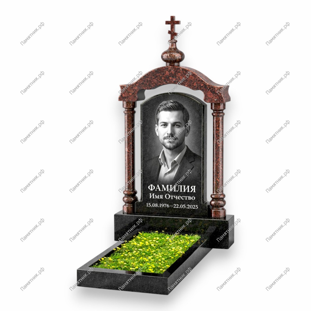 Материалом служит отборный гранит Габбро-диабаз. Камень полностью устойчив к климатическим нагрузкам СНГ. Зеркальная полировка обеспечивает мемориалу достойный вид, а широкое поле стелы внутри арки позволяет сбалансированно разместить портрет, ФИО и даты жизни.