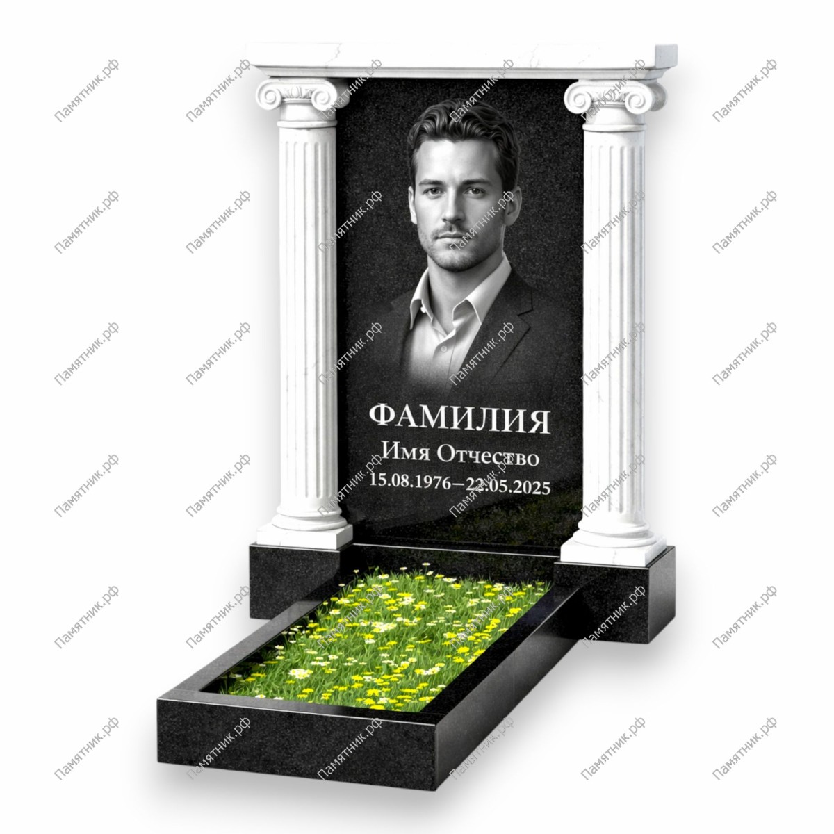 Все элементы комплекта изготовлены из премиального Габбро-диабаза. Зеркальная полировка обеспечивает мемориалу торжественный вид и защищает его от внешних воздействий. Цветник из натурального гранита позволяет аккуратно оформить территорию захоронения.