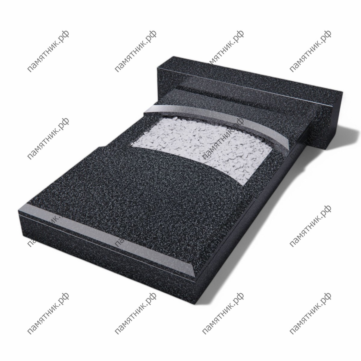 Комбинированная надгробная плита из габбро-диабаза с оригинальным пространственным решением. Широкий дугообразный вырез в верхней части цветника придает массивному камню визуальную легкость и утонченность.