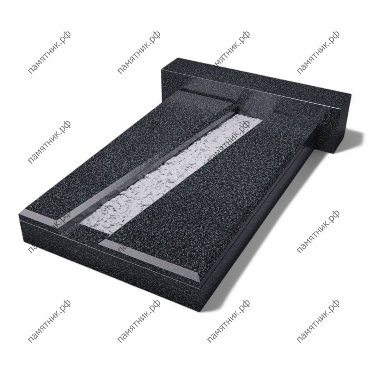 Лаконичная и строгая надгробная плита из габбро-диабаза, построенная на четкой геометрии линий. Узкий продольный цветник по центру идеально подходит для минималистичного оформления светлым щебнем.