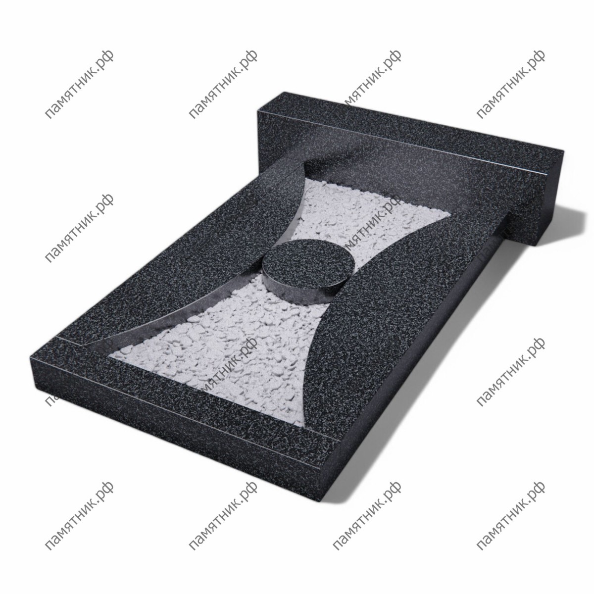 Эксклюзивная надгробная плита из габбро-диабаза со сложной архитектурой цветника. Симметричные вогнутые вырезы образуют форму, напоминающую песочные часы, а центральный круглый постамент завершает эту гармоничную композицию.