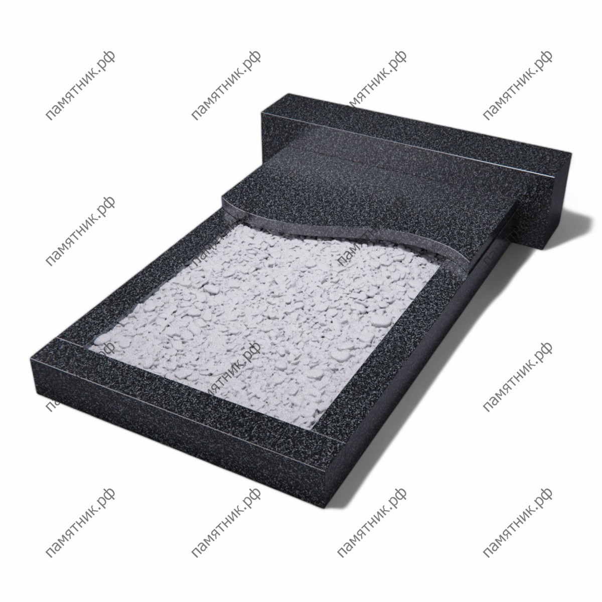 Классическая надгробная плита из габбро-диабаза с большим открытым цветником, дополненная мягкой волнообразной линией в изголовье. Дизайн удачно сочетает в себе традиционную прямоугольную форму и утонченный художественный акцент.