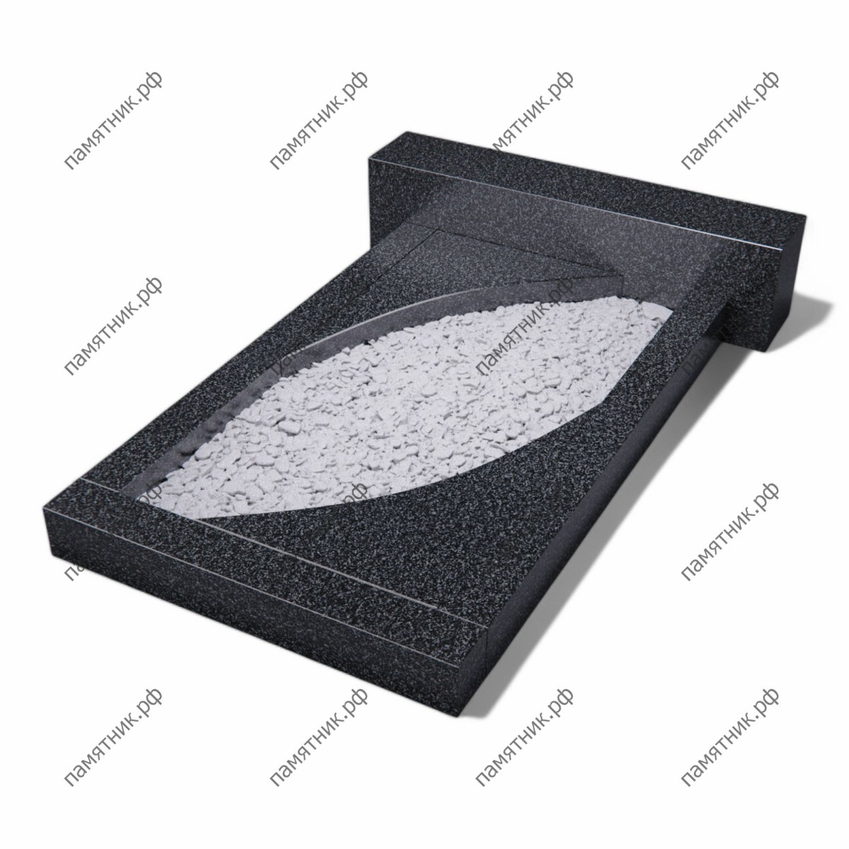 Утонченная надгробная плита из габбро-диабаза с центральным вырезом в форме листа (или маркиза). Плавные, симметричные дуги с заостренными краями придают массивному надгробию легкий, эстетичный и одухотворенный вид.