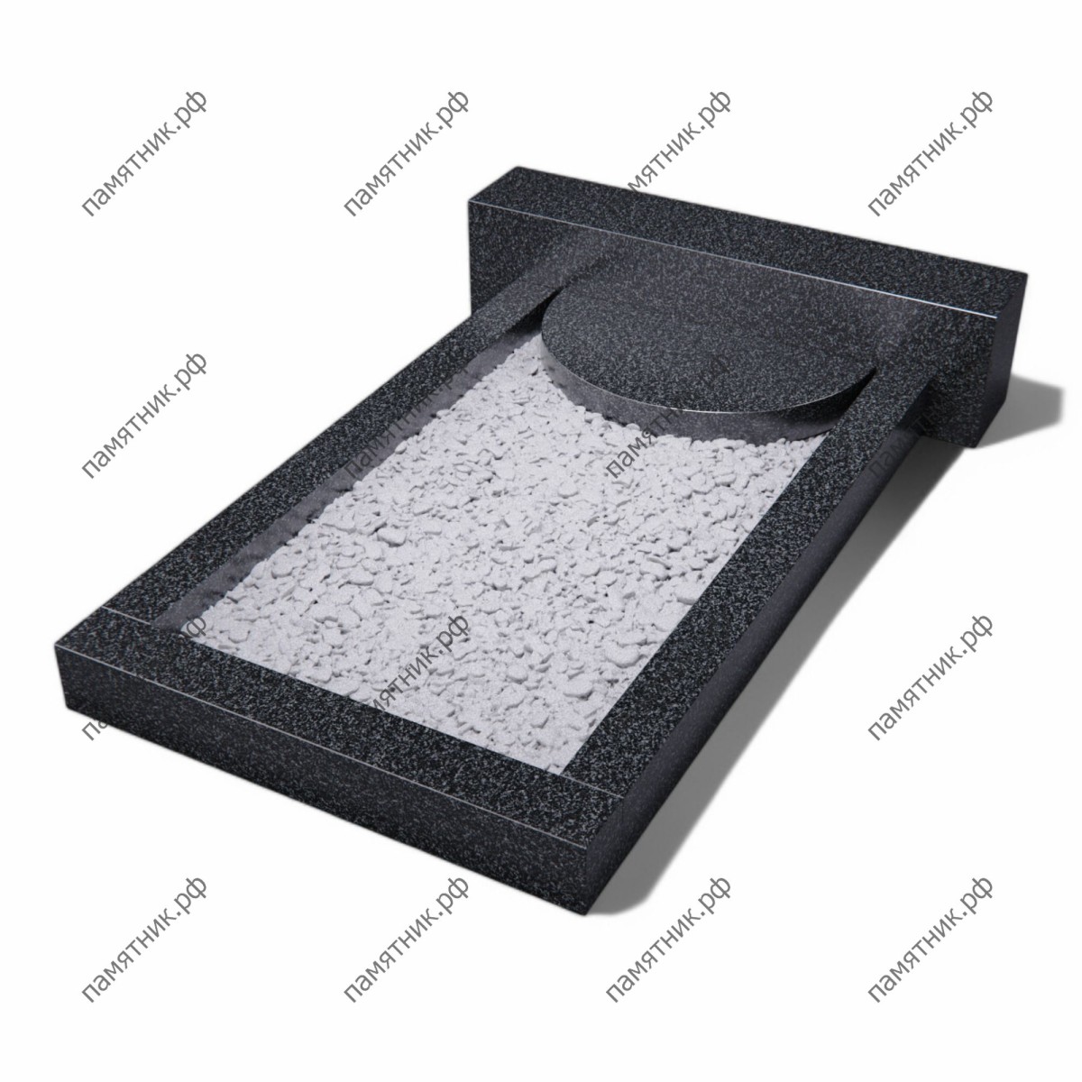 Монументальная надгробная плита из габбро-диабаза с выразительным центральным элементом. Крупный полукруглый выступ, плавно переходящий из закрытой верхней части, служит идеальной и надежной площадкой для установки вазы или лампады.