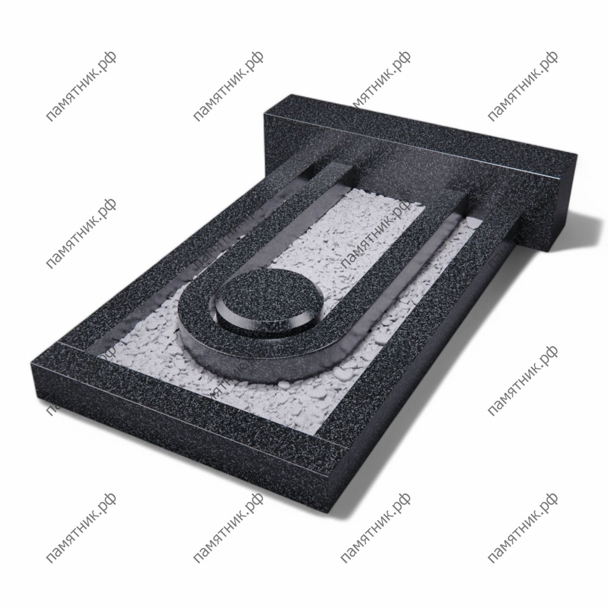 Элегантная и симметричная плита из габбро-диабаза с П-образным цветником. Геометрия надгробия позволяет красиво организовать пространство внутри рамки, сделав акцент на центральном декоративном элементе.