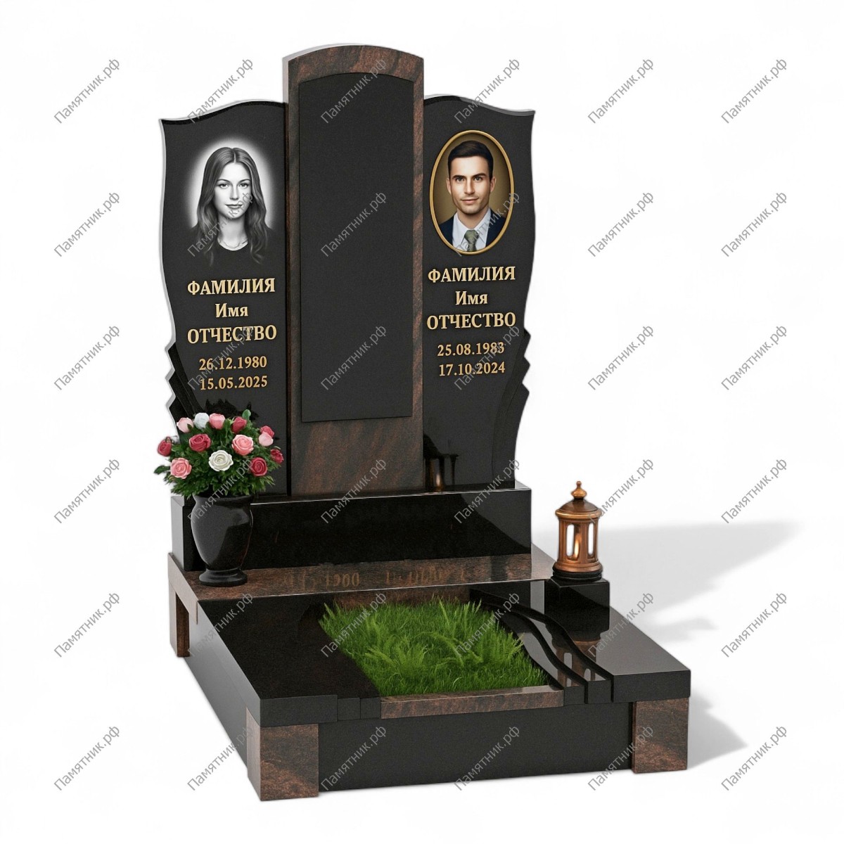 Величественный и монументальный семейный комплекс, состоящий из трех элементов. Классические черные стелы с плавными верхними гранями гармонично дополнены высокой центральной вставкой из благородного красно-коричневого гранита. Контрастное сочетание камня придает захоронению торжественный и статусный вид.