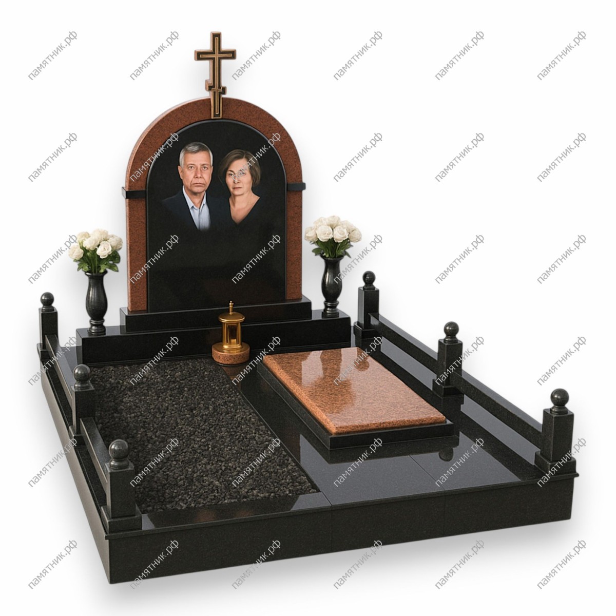 Классический арочный мемориал, выражающий торжественность, защиту и вечный покой. Центральная широкая черная стела с крупным семейным портретом элегантно обрамлена аркой из красно-коричневого гранита, увенчанной православным крестом.