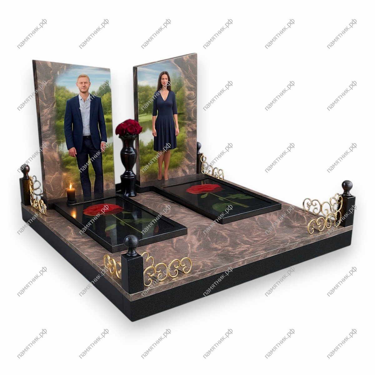 Эксклюзивный и невероятно живописный мемориал. Две высокие независимые стелы выполнены из роскошного мраморовидного гранита, на фоне которого размещены ростовые цветные портреты. Изюминкой комплекса служат надгробные плиты с 3D-изображением красных роз под стеклом.