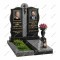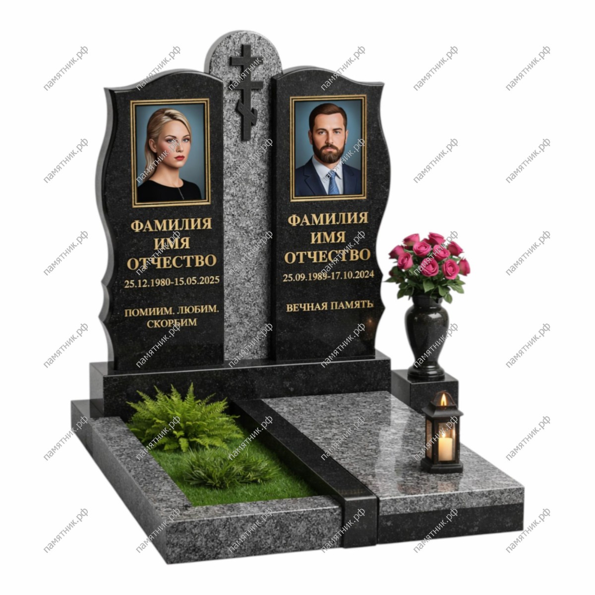 Выразительный комплекс, построенный на контрасте светлого и темного камня. Две симметричные черные стелы с плавными верхними гранями разделены высокой центральной колонной из светло-серого гранита, на которой вырезан массивный православный крест. Это решение выглядит одновременно торжественно и воздушно.