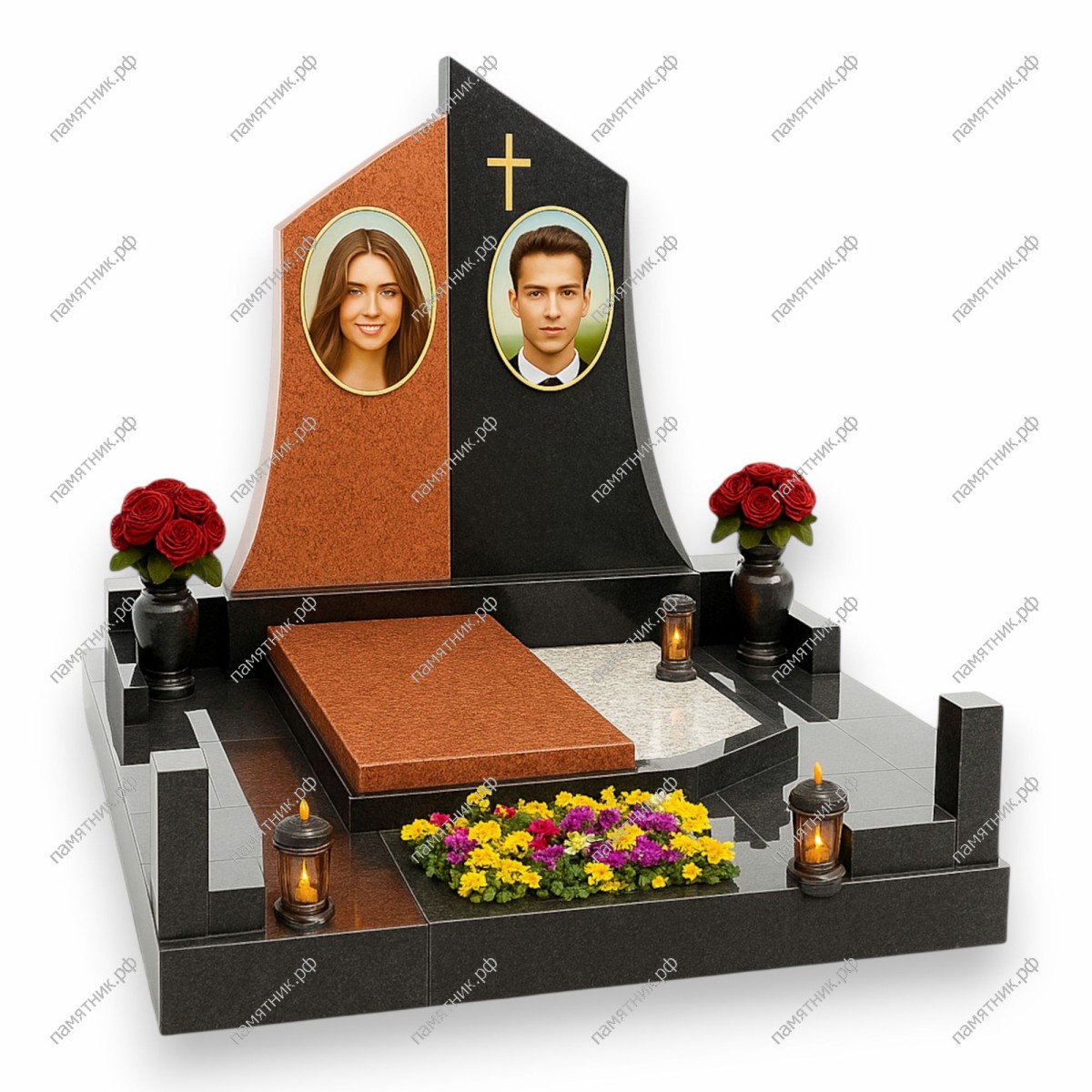 - Асимметричное надгробие с закрытой плитой и открытым цветником сложной формы.