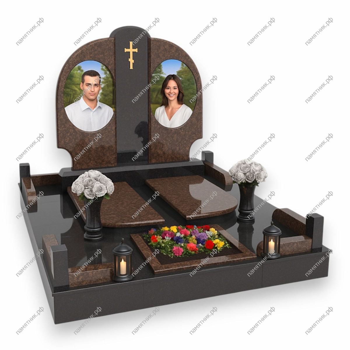 - Две фигурные надгробные плиты из коричневого гранита, повторяющие форму стел.