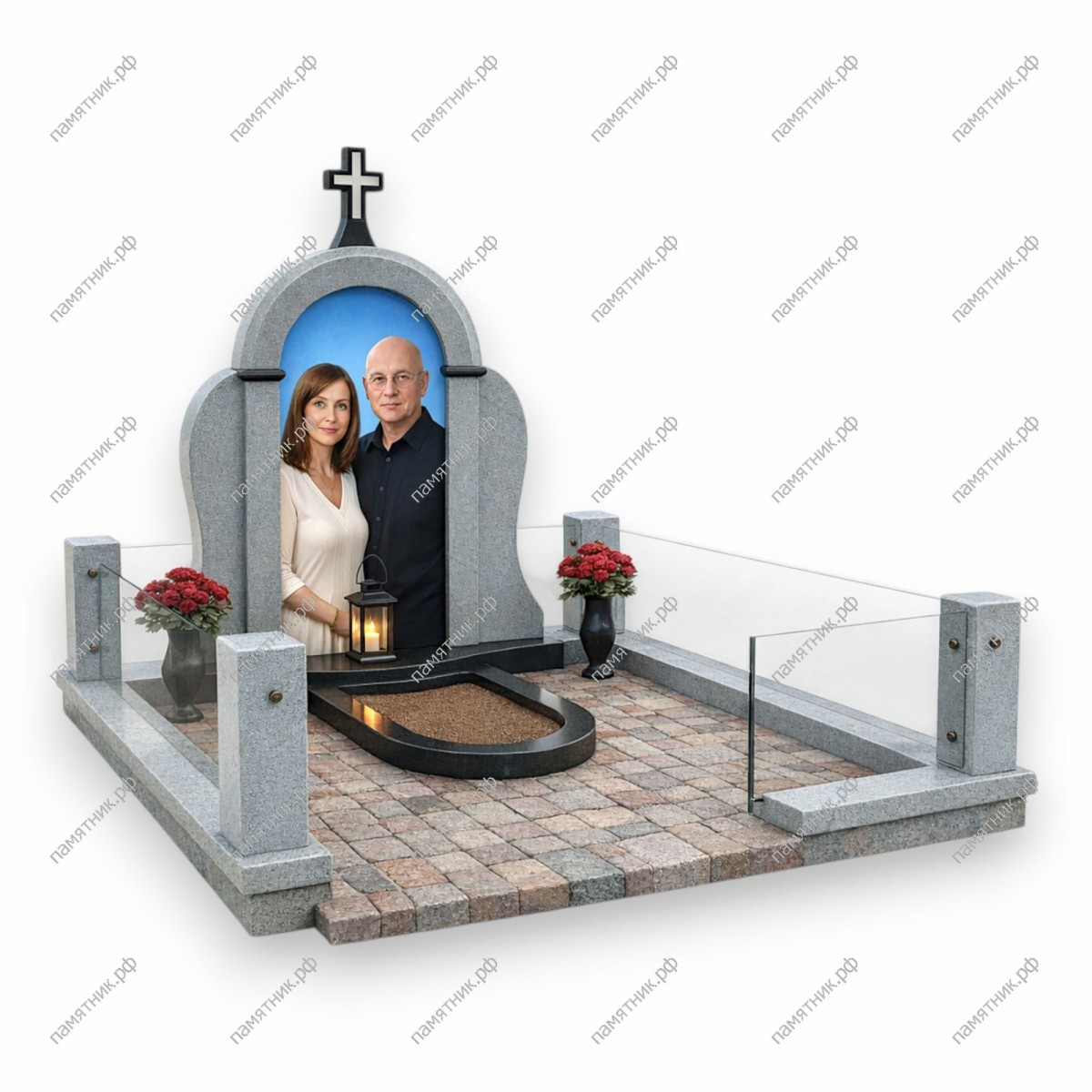Необычный и светлый мемориал, стилизованный под арку или часовню. Особенную легкость и современный вид комплексу придает нестандартное решение — ограждение из прозрачного закаленного стекла.