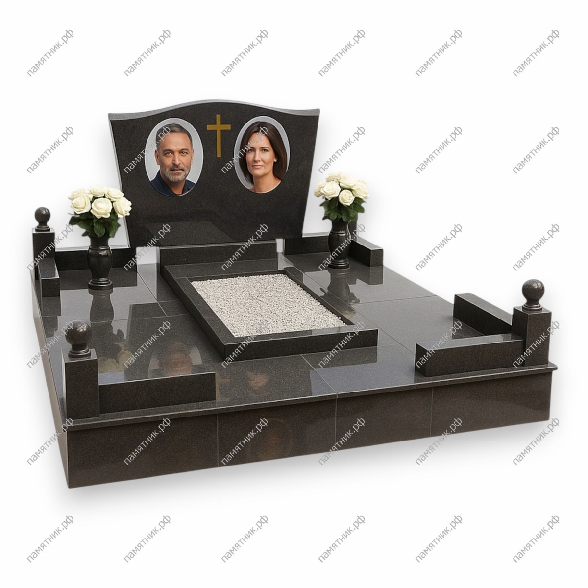 Респектабельный и строгий семейный комплекс из полированного черного гранита. Широкая горизонтальная стела с волнообразным краем объединяет два портрета, визуально разделенных золотым православным крестом.
