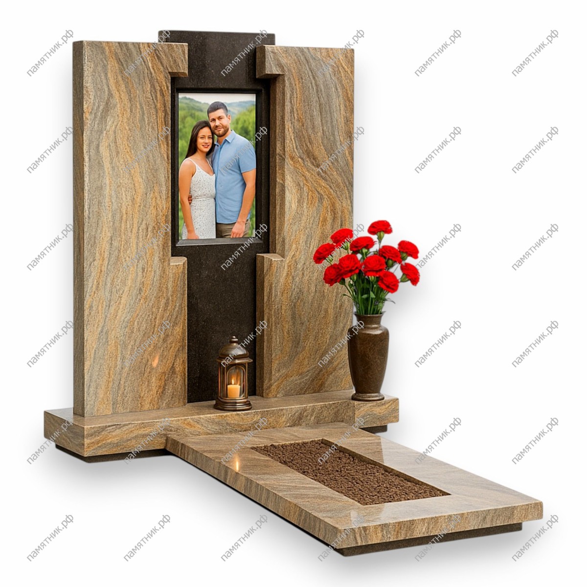 Эксклюзивный современный памятник, привлекающий внимание необычной фактурой камня песочного оттенка. Центральный строгий черный пилон с портретом стильно обрамлен массивными фигурными элементами из светлого гранита.