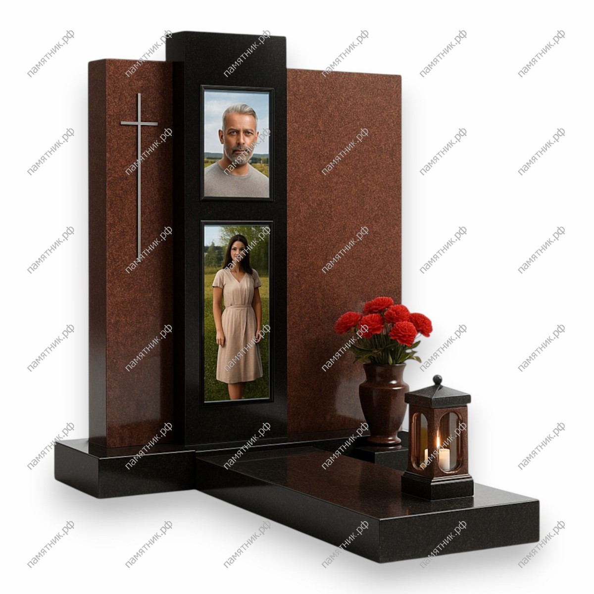 Современный асимметричный комплекс в стиле минимализм. Композиция построена на строгой геометрии прямоугольных блоков из черного и красно-коричневого гранита, с нестандартным вертикальным расположением портретов.