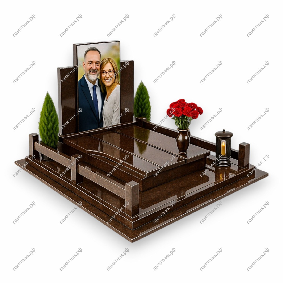 Монументальный семейный комплекс, выполненный в едином цвете из глянцевого коричневого гранита. Многоуровневая архитектура с четкими прямоугольными линиями подчеркивает статус и благородство захоронения.