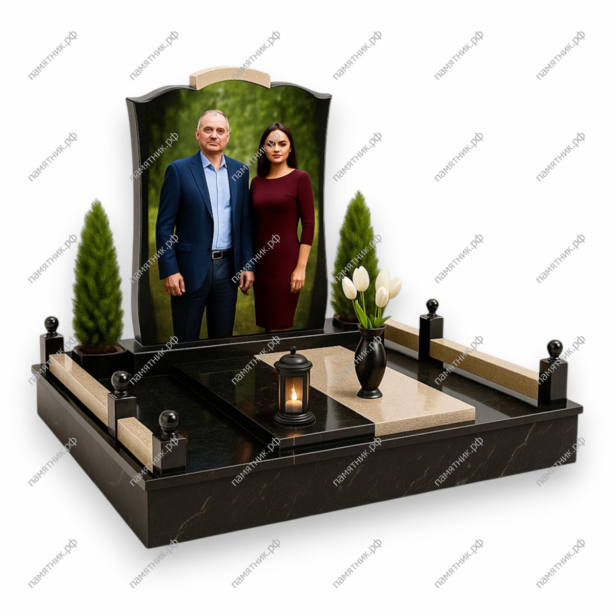 Классический семейный памятник с элегантными светлыми акцентами. Плавные линии широкой черной стелы гармонично дополнены бежевыми декоративными элементами на навершии и ограде.