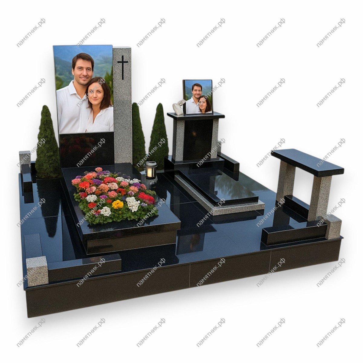 - Комбинированное надгробие с большим открытым цветником и закрытой плитой.