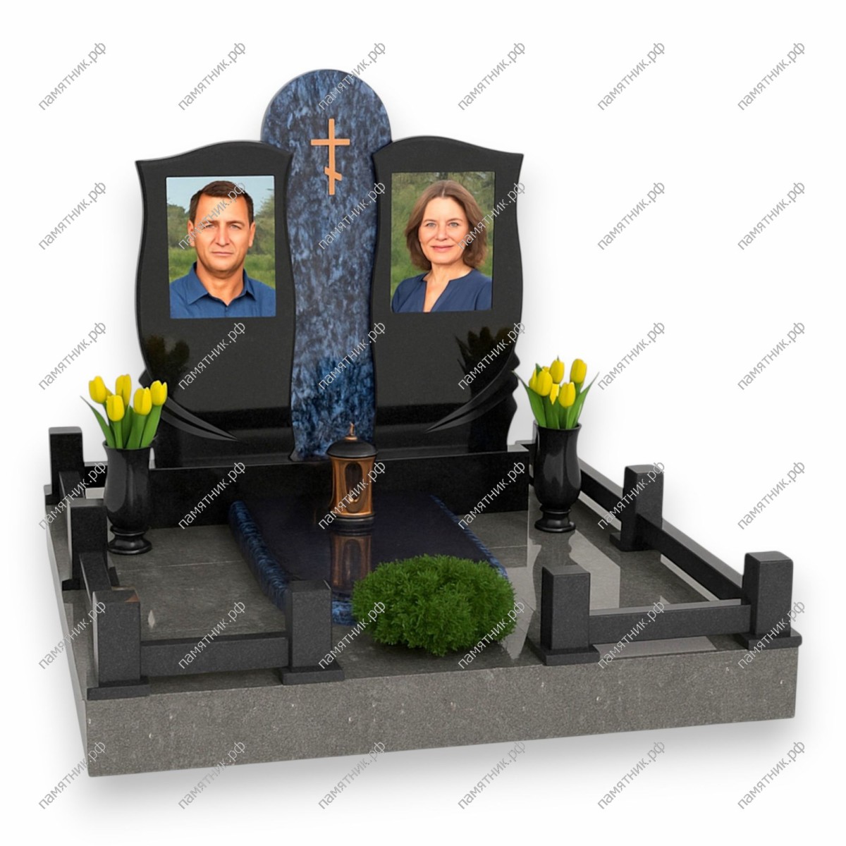 - Возвышающийся центральный пилон из фактурного сине-голубого гранита с золотым крестом.