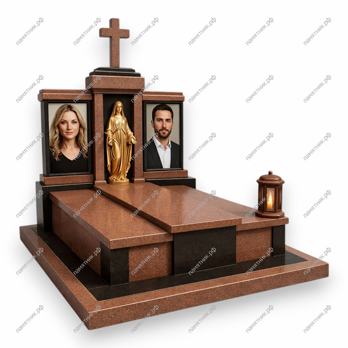 - Сложная архитектурная форма стелы с центральной нишей и венчающим крестом.