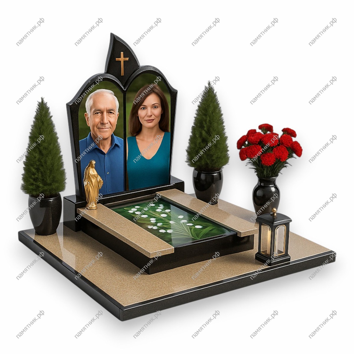 Выразительный памятник в форме классического арочного свода. Сочетание строгого черного гранита с теплыми бежевыми оттенками основания и уникальной декоративной вставкой с цветами создает светлый и памятный образ.